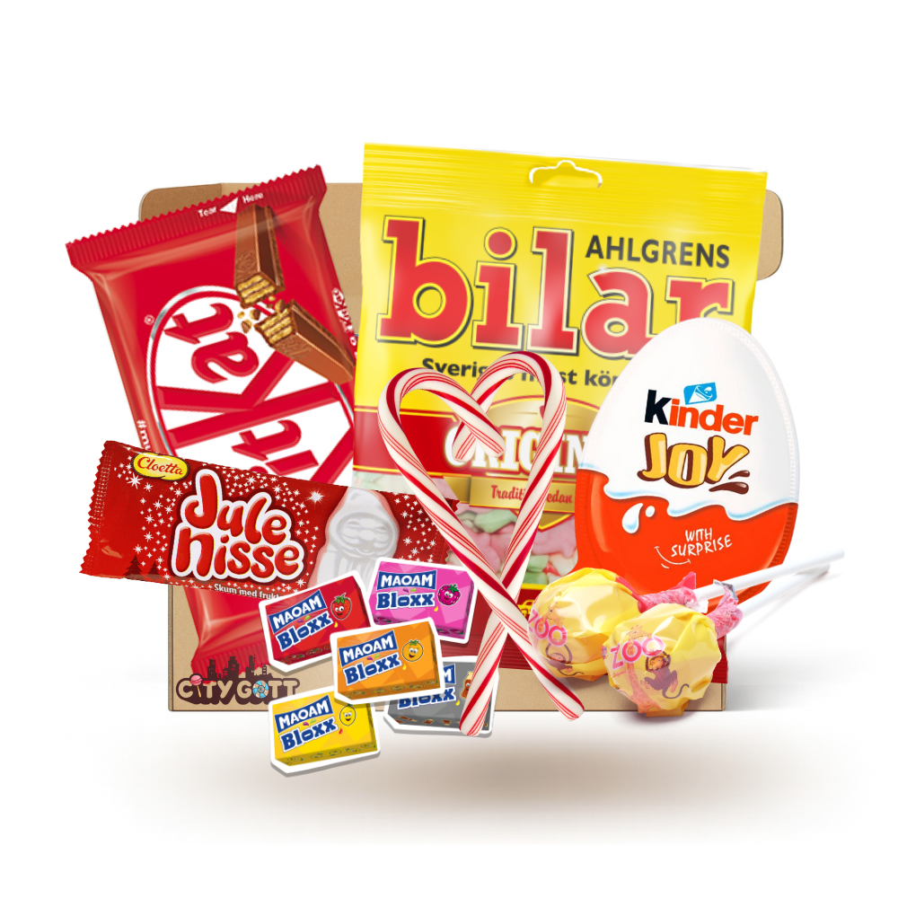 Kinder Joy 20g, Ahlgrensbilar 125g, 1 KitKat 41.5g, Julenisse 22g, 4st Maoam Bloxx, 2st polkakäppar, 2st zoo klubba.