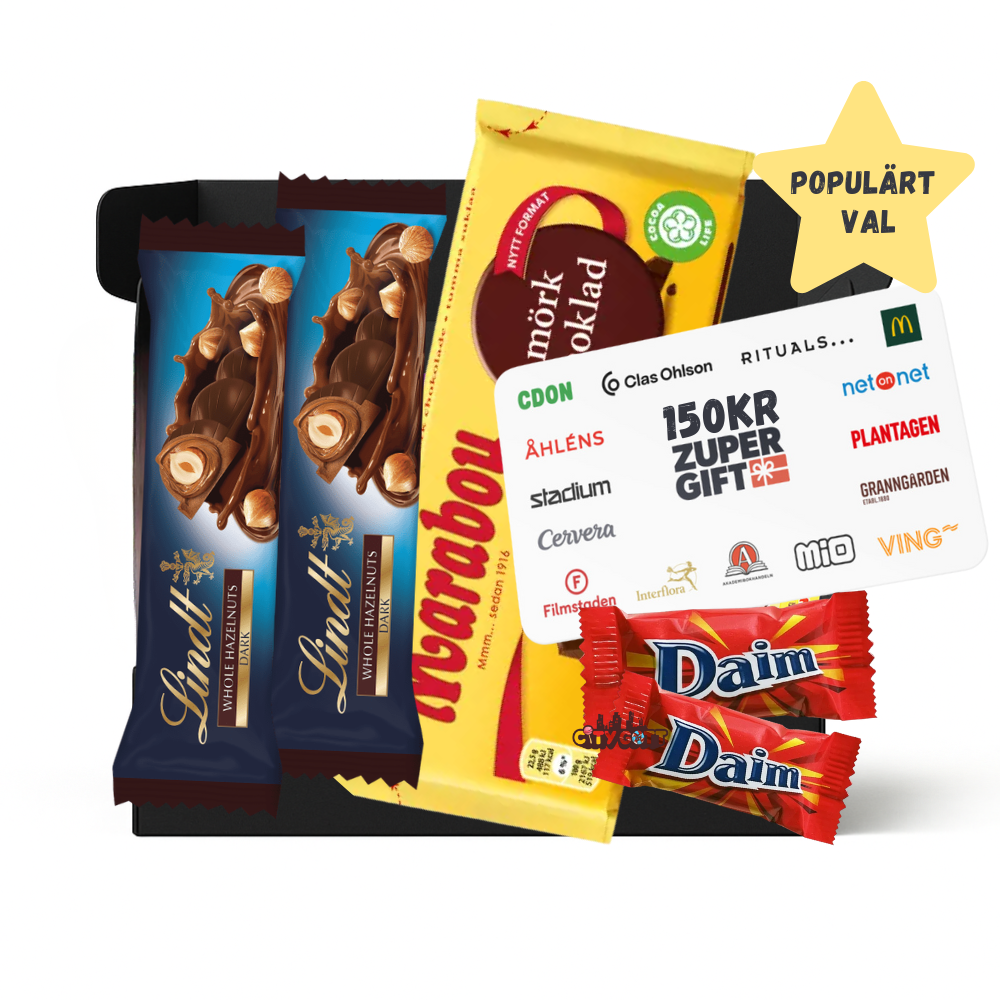 Innehåll: 1 st presentkort (Zupergift) 150 kr, 2 st Lindt choklad 35g Hazelnuts Dark, 1 st Marabou Mörk choklad 180g och 2 st Daim mini.