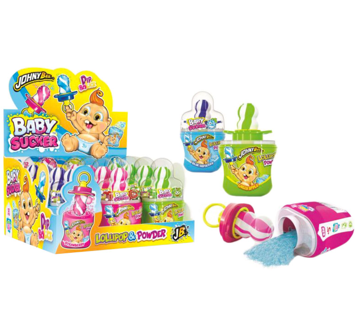 Baby Sucker Godisklubba omfattar en godisklubba med godis-pulver som klubban doppas i. Finns i smakerna blåhallon, jordgubb och grönt äpple, vilken du får slumpas.