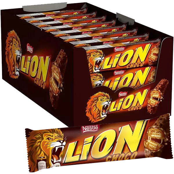 Lion är en läcker kombination av krispigt fyllt rån, söt karamell och spröda korn som är täckt av mjölkchoklad.