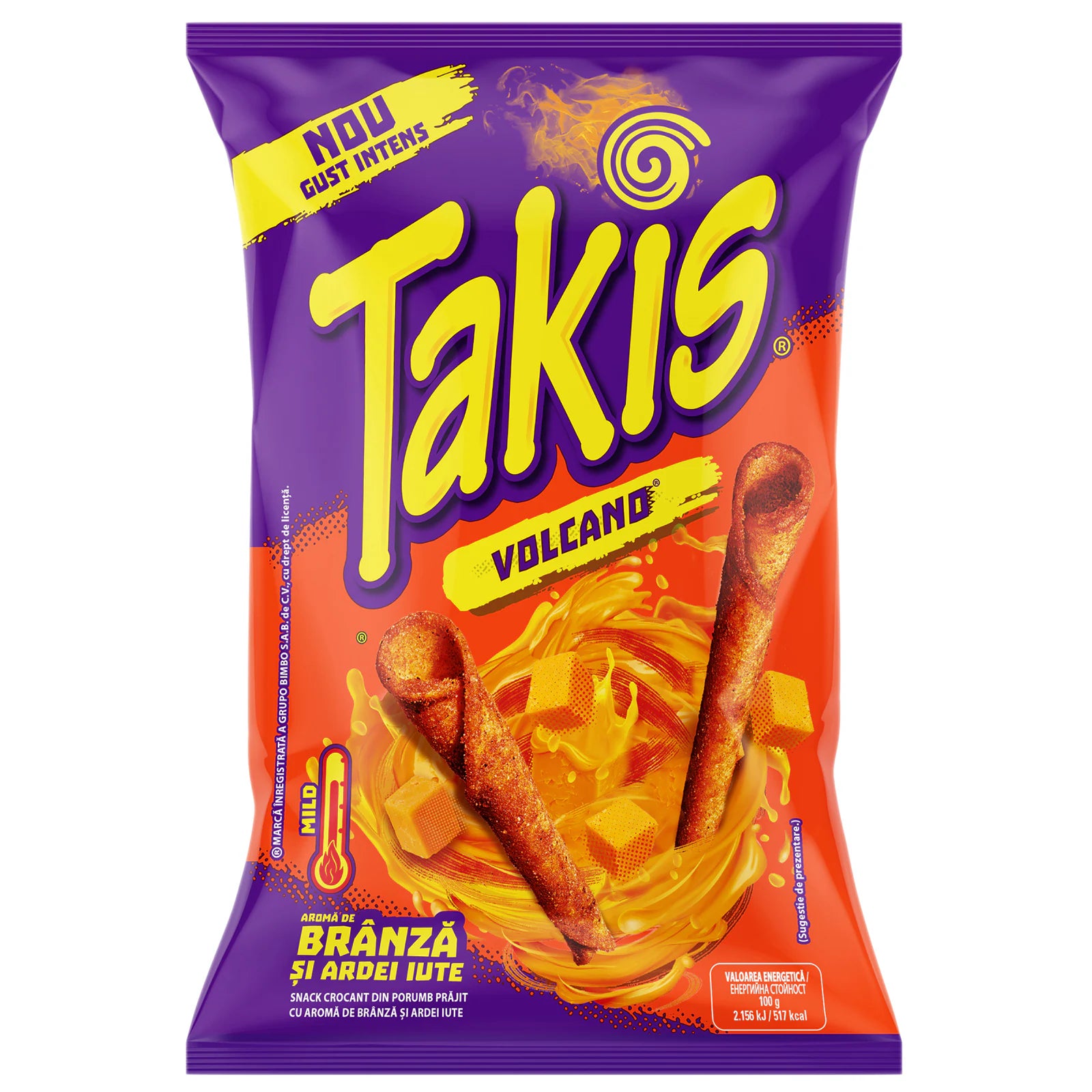 Njut av en underbar smak av queso, det vill säga ost, med Takis Queso Volcano! Takis är det populära och mexikanska snackset som blivit en sensation världen över. Ihoprullade friterade tortillas som bjuder på underbart krisp och grym smak. Denna smak är perfekt för alla ostälskare – Takis Queso Volcano lever verkligen upp till sitt namn och bjuder på en stark och grym smak av ost. 100g.