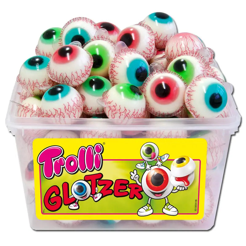 Trolli Glotzer Eyes - godis-ögonbollar tillverkade i skumgelé med fruktsmak och en sur fyllning inuti.