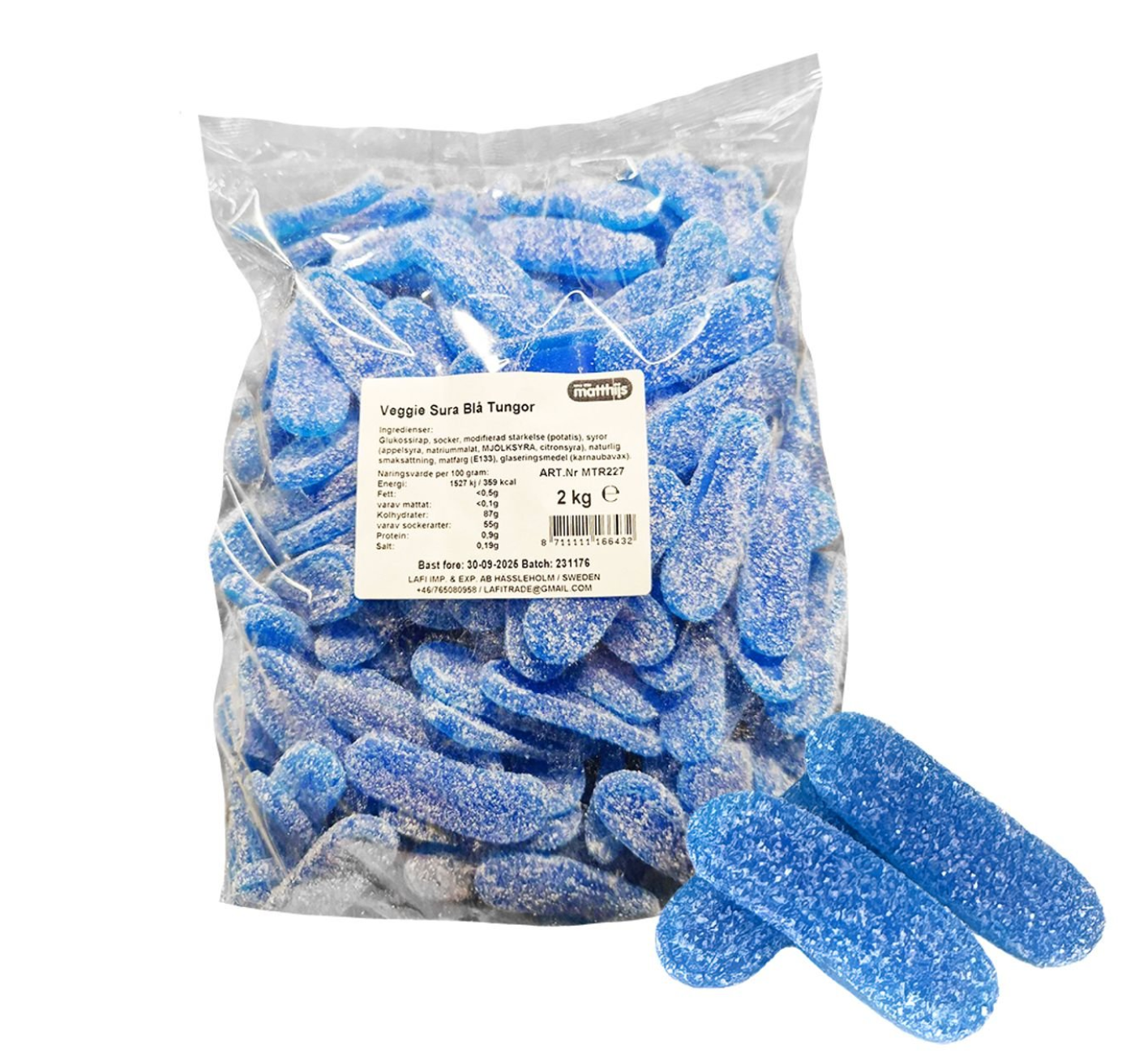 Ingredienser: Glukossirap, socker, modifierad stärkelse (potatis), förtjockningsmedel: Pektin, Surhetsreglerande medel: E330, E296, E350, E270, Naturliga aromer, Färgämnen: E133, Ytbehandlingsmedel: E903.